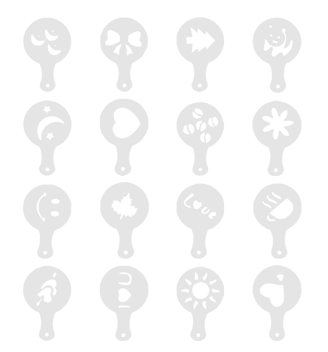 Un set de 16 șabloane reutilizabile pentru decorarea cafelei și deserturilor. Fiecare dintre șabloane este responsabil pentru o ocazie și o stare de spirit diferită, datorită cărora îți vei personaliza perfect cafeaua de dimineață sau vei străluci alături de invitații tăi ca barista profesionist :)