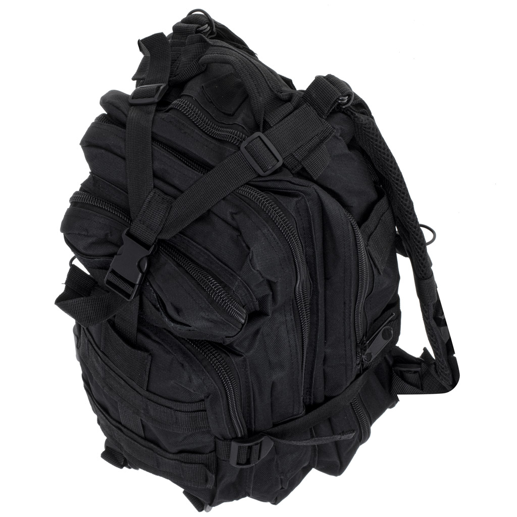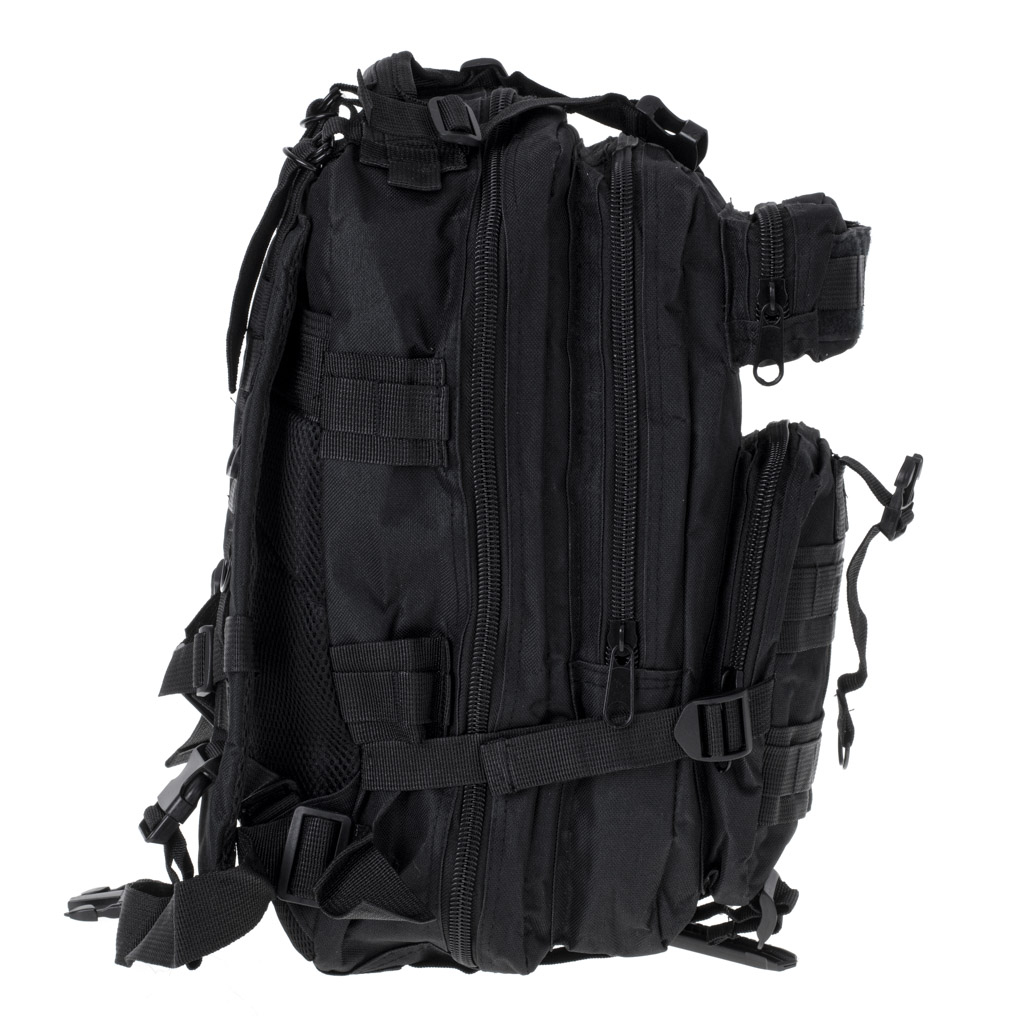 Un accesoriu practic și chiar obligatoriu în timpul oricărei expediții militare sau de supraviețuire! Capacitatea totală este de 25l, oferită de cinci buzunare, inclusiv două mari, cu compartimente interioare pentru o organizare eficientă. Toate buzunarele externe se închid cu fermoare, iar curelele de compresie laterale și inferioare permit ajustarea dimensiunii rucsacului. Bretelele de umăr sunt reglabile sus și jos, iar centurile de șold și piept distribuie uniform greutatea. Spatele și bretelele sunt rigidizate și din plasă respirabilă. Rucsacul este ideal pentru militari, cercetași, camping, drumeții sau uz zilnic. Materialul din poliester și manopera asigură rezistență la rupere și abraziune. Culoare: negru.