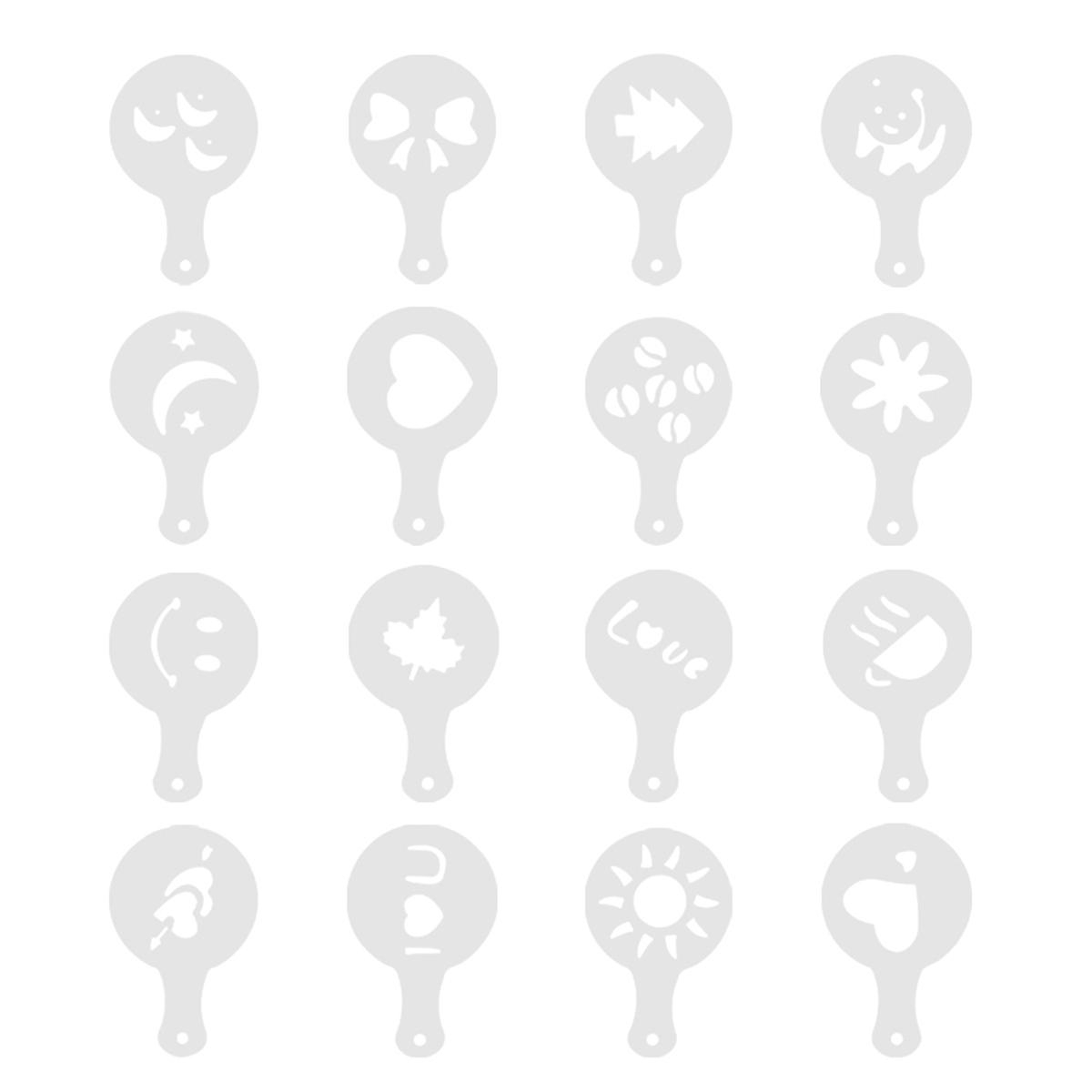 Un set de 16 șabloane reutilizabile pentru decorarea cafelei și deserturilor.