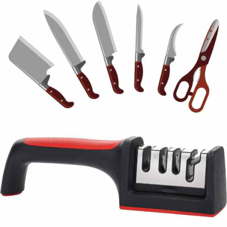 Ascutitor pentru Cutite si Foarfece, 4 Niveluri, Maner Ergonomic, Negru cu Rosu, 21.5 x 5 x 5.6 cm – Precizie si Siguranta in Bucatarie