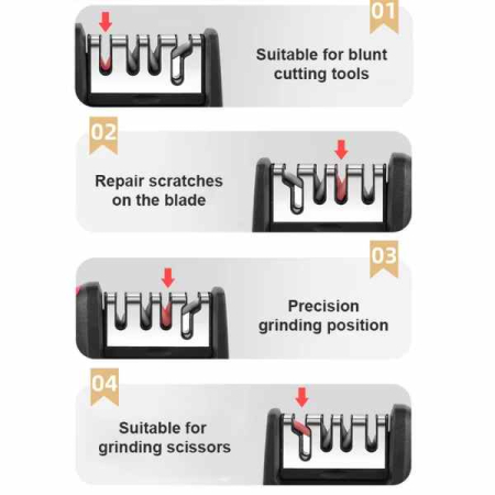 - ✔️ 4 nivele de ascutire: 3 pentru cutite si 1 pentru foarfece.