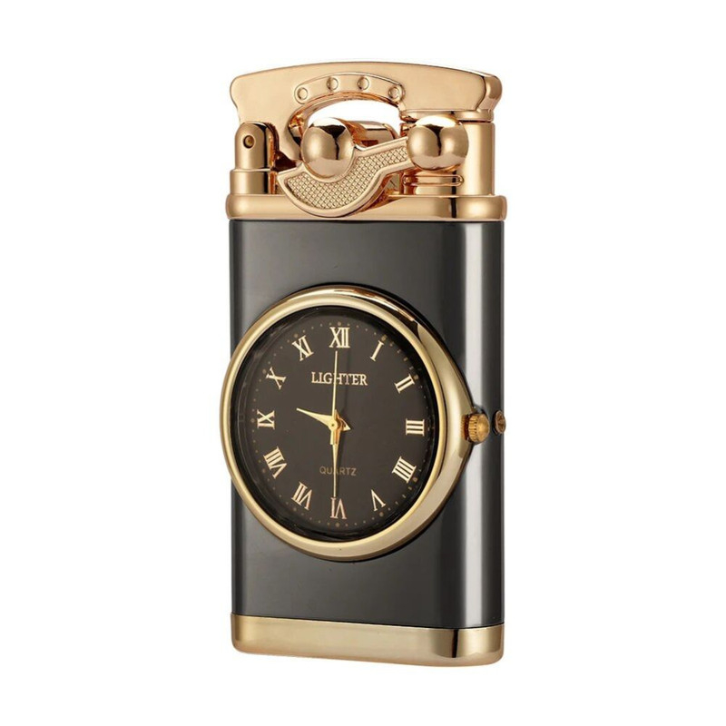 Bricheta Reincarcabila cu Ceas Incorporat, Flacara Alba Antivant si Design Negru cu Auriu, Reincarcabila cu Gaz Butan