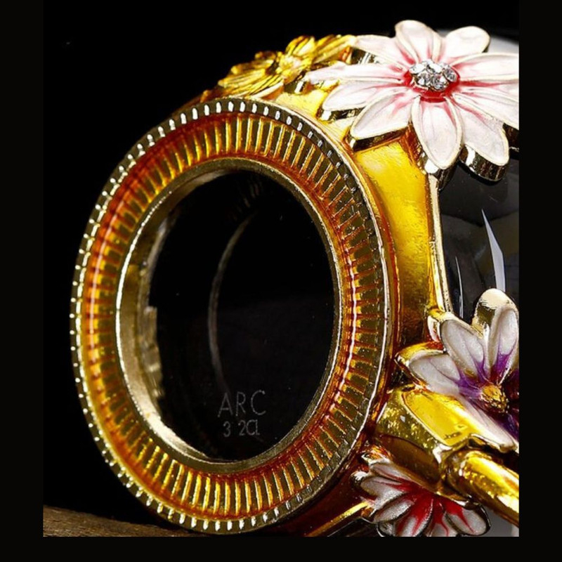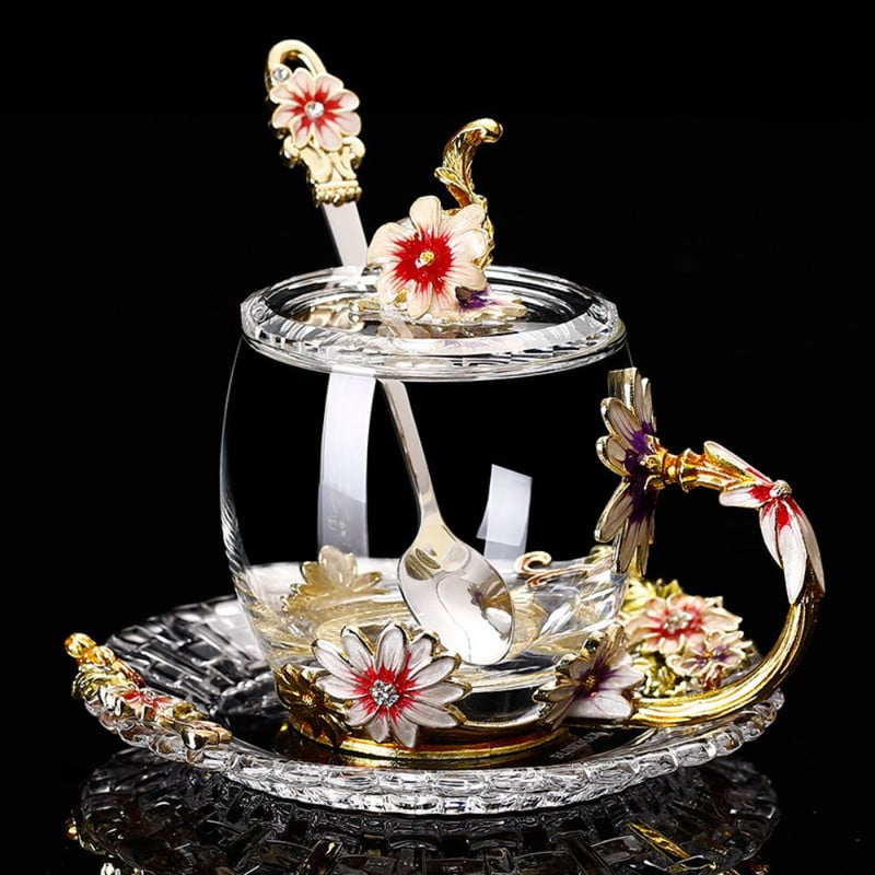 Transforma fiecare moment de relaxare intr-o experienta regala cu Cana Handmade Fleur-de-Lis, decorata manual cu email si pietre multicolore pentru un aspect nobil si rafinat. Fabricata din sticla transparenta termorezistenta, este rezistenta la temperaturi ridicate si durabila in timp. Setul complet include capac, lingurita si farfurie, pentru o experienta completa la servirea ceaiului sau cafelei. Designul floral artistic si pietrele decorative colorate adauga un farmec unic, iar ambalajul in cutie cadou premium o face ideala pentru cadouri rafinate. Produsul respecta Regulamentul General privind Siguranta Produselor (GPSR).