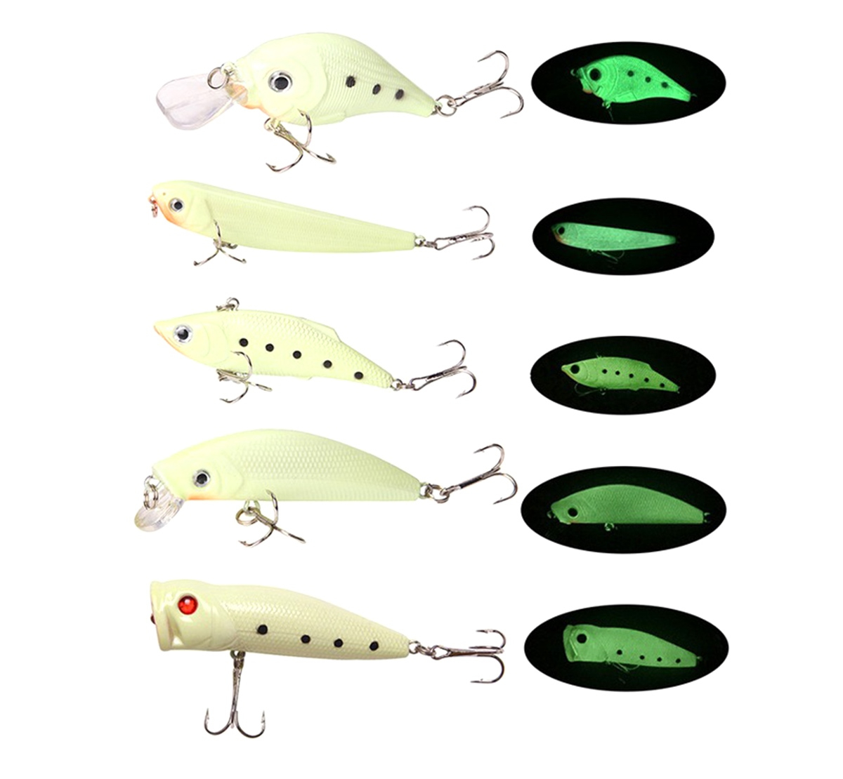 Nalucile sunt adaptate preferințelor peștilor pradatori, iar acoperirea fluorescentă sporește vizibilitatea în apă. Trebelele ascuțite mecanic asigură o prindere sigură a peștelui. Cutia solidă facilitează transportul și protejează voblerele.