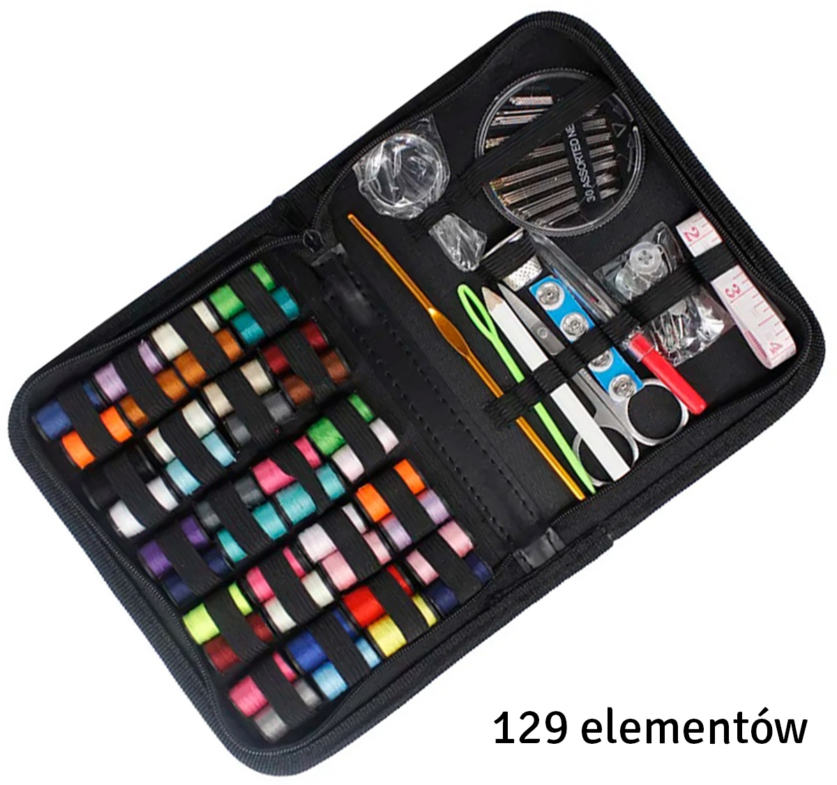 Un set complet de cusut cu până la 129 de elemente. Un cadou perfect pentru pasionații de croitorie, copii sau adulți. Toate accesoriile sunt realizate din materiale solide și se potrivesc perfect în mână, făcându-le potrivite și pentru profesioniști. Husa practică cu fermoar are spațiu pentru o serie de accesorii (ace, fire, ace de siguranță, foarfece, bandă de măsurare etc.).