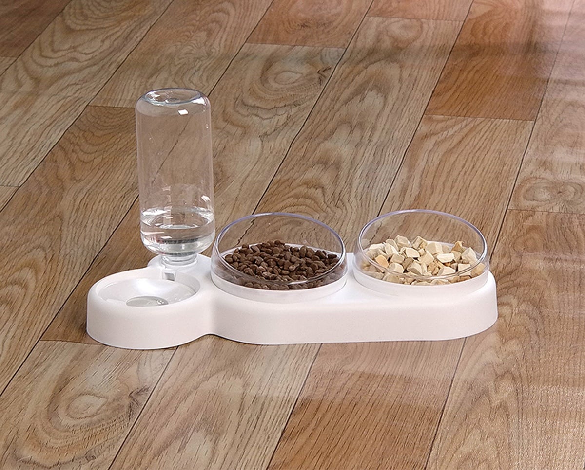 Dozator automat de apa si bol dublu pentru mancarea pisicilor. Panta castronului la un unghi de 15 grade face ca animalul tau sa manance mai usor. Sticla de apă cu o capacitate de 0,5 L permite animalului dumneavoastră să aibă acces la apă proaspătă în orice moment. Datorită unei supape speciale, dispozitivul adaugă automat apă din rezervor în vas. Designul compact va funcționa bine în bucătăriile mici și coridoarele.