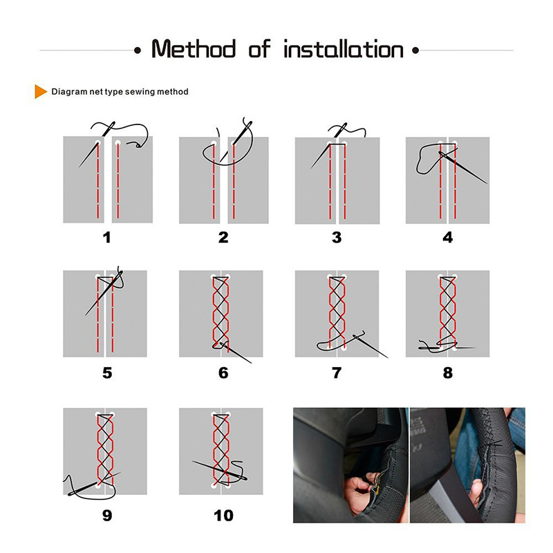 Husa volan din PIELE cu ac si ata, aspect ORIGINAL. Montaj simplu, ata existenta in pachet se trece cu ajutorul acului direct prin cusatura existenta pe husa de volan astfel incat cusatura va capata un aspect de volan imbracat de fabrica.