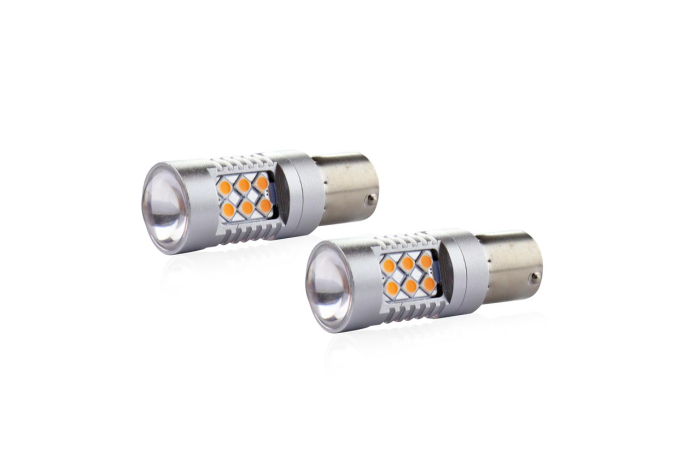 Set becuri auto cu LED CANBUS P21W BA15S 24 SMD 6.2W Orange 12/24V, cu dimensiunea 56/18mm, culoare portocalie și 24 LED-uri 3030. Consumă 6.2W și funcționează la tensiune de 12/24V, având soclu 1156 (P21W) cu o singură fază și o intensitate luminoasă de 800lm.