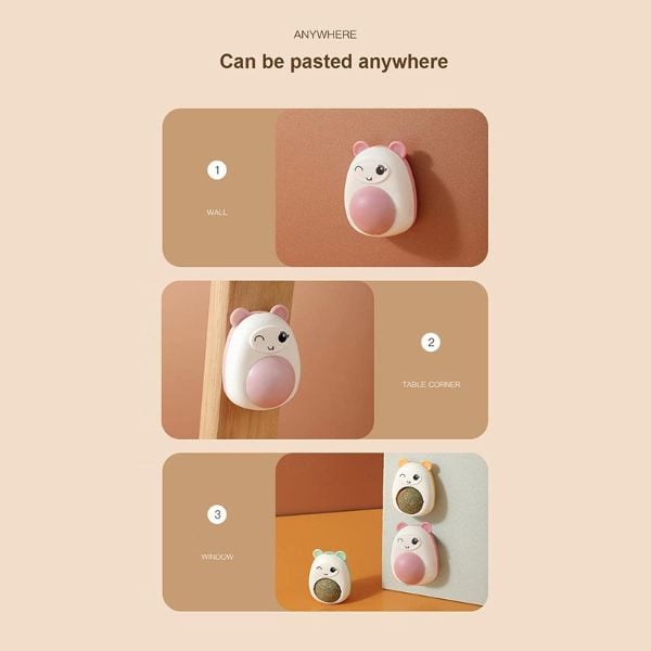 Se monteaza pe suprafete plane sau pe perete cu ajutorul benzii adezive. Pisica poate interactiona cu mingea rotativa pentru stimulare si igiena orala, fiind potrivita pentru joaca zilnica si pentru incurajarea activitatii fizice.
