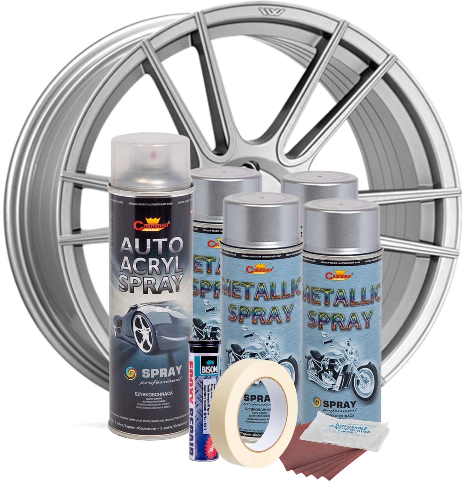 Kit complet de reparatie, reconditionare si vopsire jante, destinat utilizarii DIY, ce poate fi folosit de orice persoana urmând instructiunile din pachet. Kitul contine: 4 spray-uri vopsea 400 ml, 1 spray lac transparent 500 ml, 1 chit de umplere special pentru jante din aliaj, set manusi de unica folosinta, set smirghel cu granulatii diferite pentru finisare si o rola banda de mascare pentru protejarea marginii anvelopei. ATENTIE! Janta din imagini nu este inclusa.