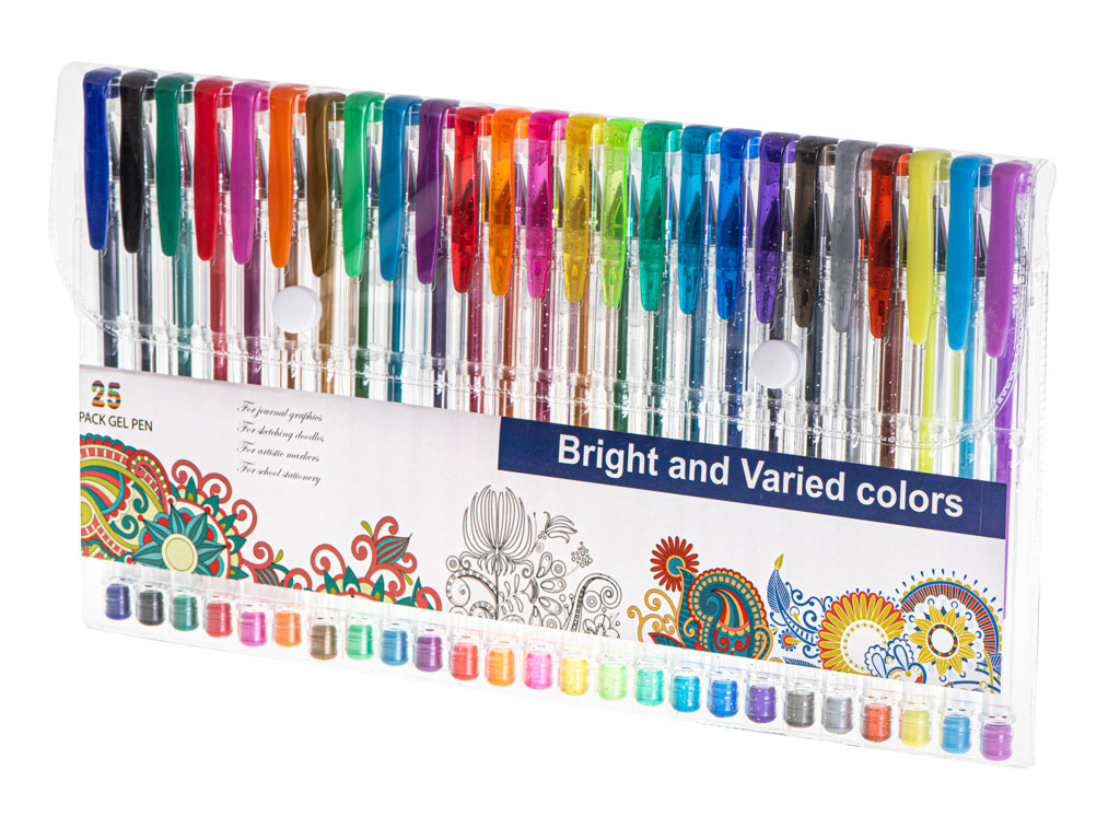 Chiar și cei mai mari artiști au nevoie de instrumentele potrivite pentru a crea opere frumoase! Setul cu 25 pixuri cu gel este ideal atât pentru adulți, cât și pentru copii, oferind o gamă variată de culori adaptate nevoilor dvs. Pixurile sunt concepute pentru scris și desenat pe hârtie, incluzând 12 pixuri cu sclipici pentru efecte strălucitoare, 7 pixuri cu cerneală metalică pentru un stil unic, 3 culori fluorescente și 3 standard (negru, albastru, roșu). Toate pot fi depozitate convenabil într-un pachet de plastic, facilitând organizarea și accesul rapid.