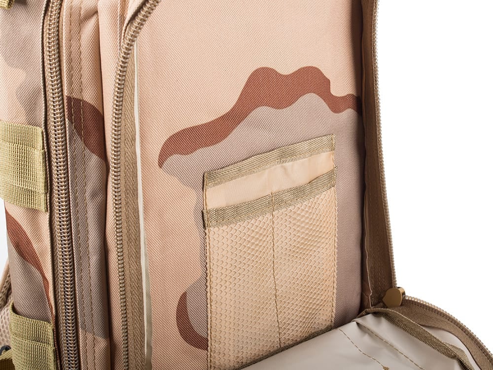 Rucsacul oferă o organizare practică prin multiple buzunare și compartimente, asigurând acces rapid la obiecte. Materialul impermeabil și rigidizarea spatelui sporesc durabilitatea și confortul, iar sistemul MOLLE permite personalizarea în funcție de necesități. Centurile reglabile reduc oboseala la purtare pe distanțe lungi.