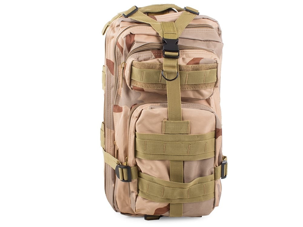 Rucsacul tactic militar, cu o capacitate de 30L, este impermeabil și rezistent la abraziuni, ideal pentru activități în orice condiții meteo. Dispune de 5 compartimente, inclusiv un buzunar ascuns pentru obiecte de valoare sau sistem Hydro Pack. Compartimentul principal se deschide larg cu fermoar dublu, iar celelalte buzunare permit organizarea eficientă a obiectelor mici. Sistemul MOLLE permite adăugarea de module suplimentare. Echipat cu centuri de piept și șold reglabile pentru stabilitate și confort, bretele rigide și spate ventilat cu burete pentru susținere și izolație termică. Dimensiuni: 43x24x25 cm, culoare bej camuflaj, material dominant nailon.