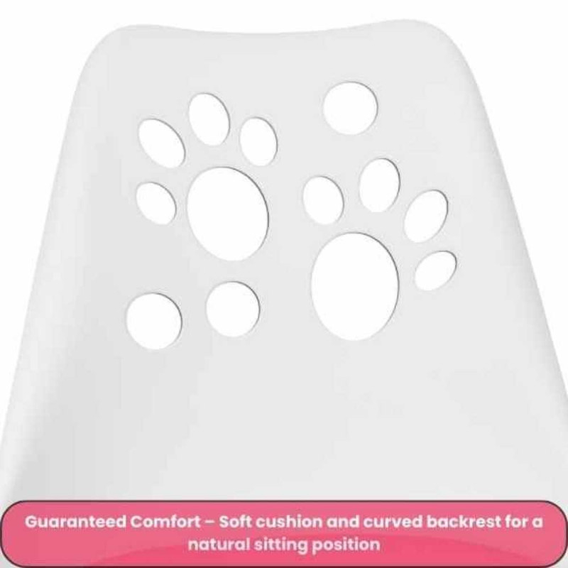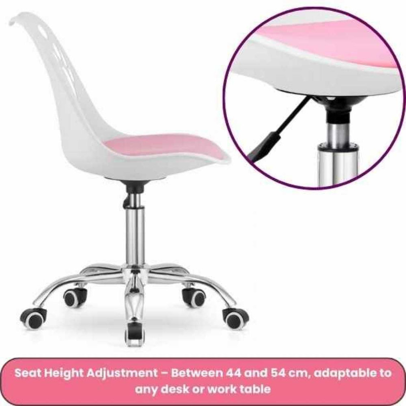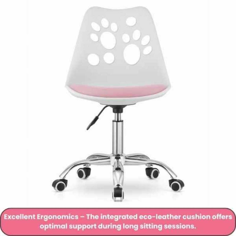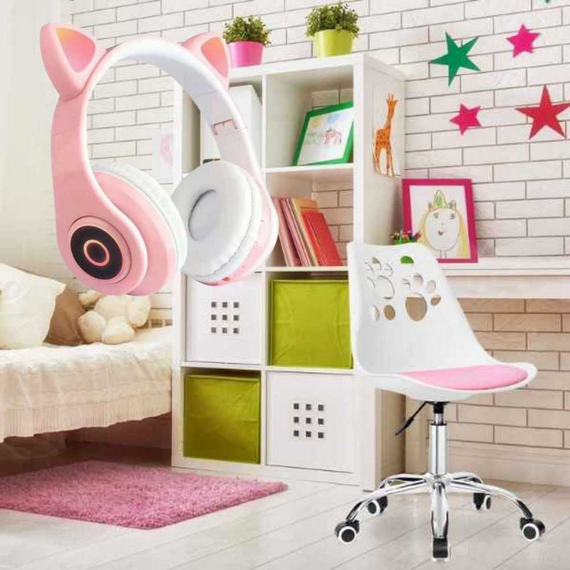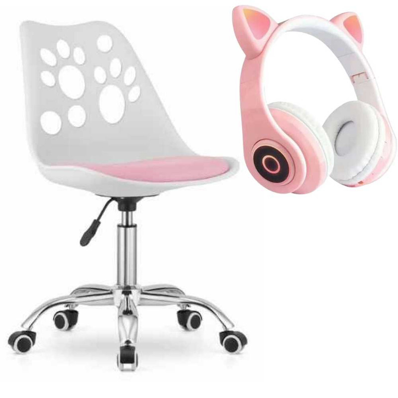 Scaunul de birou ergonomic cu perna din piele ecologica si sezut din PP, pe cadru aluminiu cromat, ofera sustinere si confort zilnic. Cu dimensiuni de 50 x 60 x 89 cm si greutate de 5.1 kg, include 5 roti cauciuc silentioase si reglaj pe inaltime (79–89 cm). Castile wireless cu urechi pisica, Bluetooth 5.0, microfon integrat si LED RGB, dispun de slot microSD si radio FM, oferind sunet echilibrat prin drivere de 40 mm. Setul combina functionalitate si stil alb cu roz pentru birouri moderne.