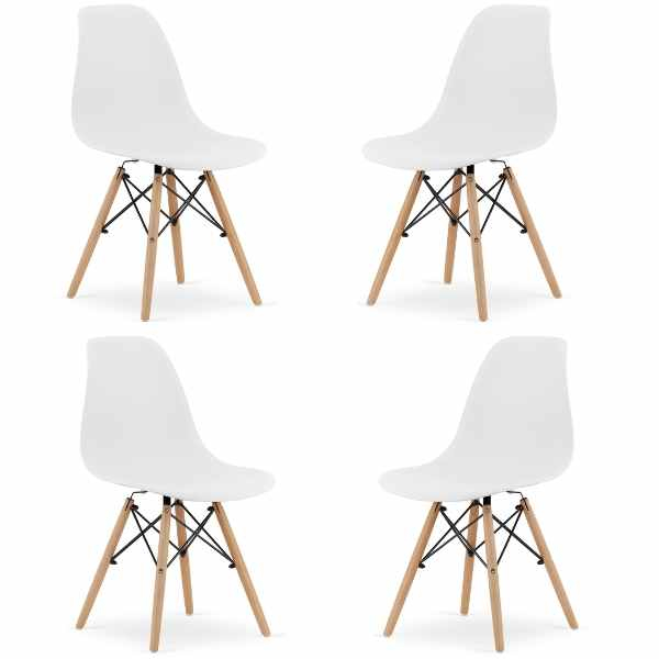 Acest set de scaune cu design scandinav aduce rafinament si confort oricarui interior modern. Picioarele din lemn de fag natural si cadrul metalic asigura durabilitate si stabilitate. Sezutul din polipropilena alba este rezistent si usor de intretinut, potrivit pentru utilizare frecventa. Cu dimensiuni compacte de 40 x 50 x 77 cm si greutate redusa de 3.3 kg pe scaun, acestea sunt usor de manevrat. Capacitatea maxima este de 120 kg. Designul ergonomic si sezutul usor inclinat ofera confort optim si sustin o postura corecta, fiind ideale pentru spatii rezidentiale si comerciale.