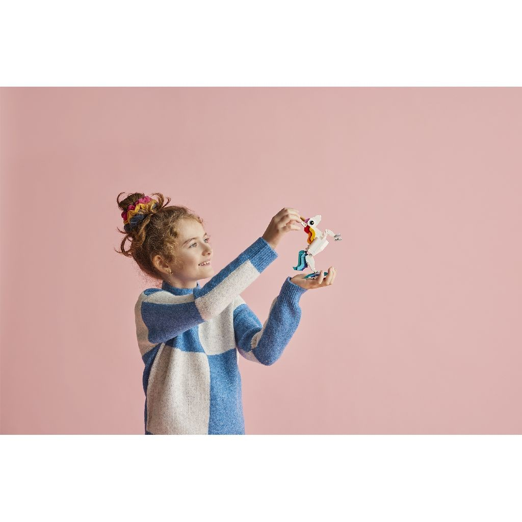 Setul Unicorn Magic 31140 oferă copiilor creativi peste 7 ani oportunitatea de a construi și reconstrui trei creaturi magice diferite, inclusiv un unicorn cu corn auriu și picioare articulate. Acest model 3-în-1 stimulează imaginația prin posibilitatea de a transforma piesele într-un calut de mare sau un paun fermecător, fiecare cu elemente mobile. Jucăria include un stativ curcubeu pentru expunere și este însoțită de o aplicație digitală care permite vizualizarea modelelor în 3D.